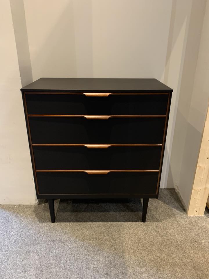 Stunning Mid Century Modern chest of 4 drawers, finished in back with restored wood handles.