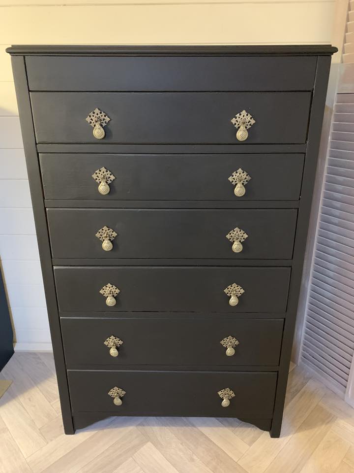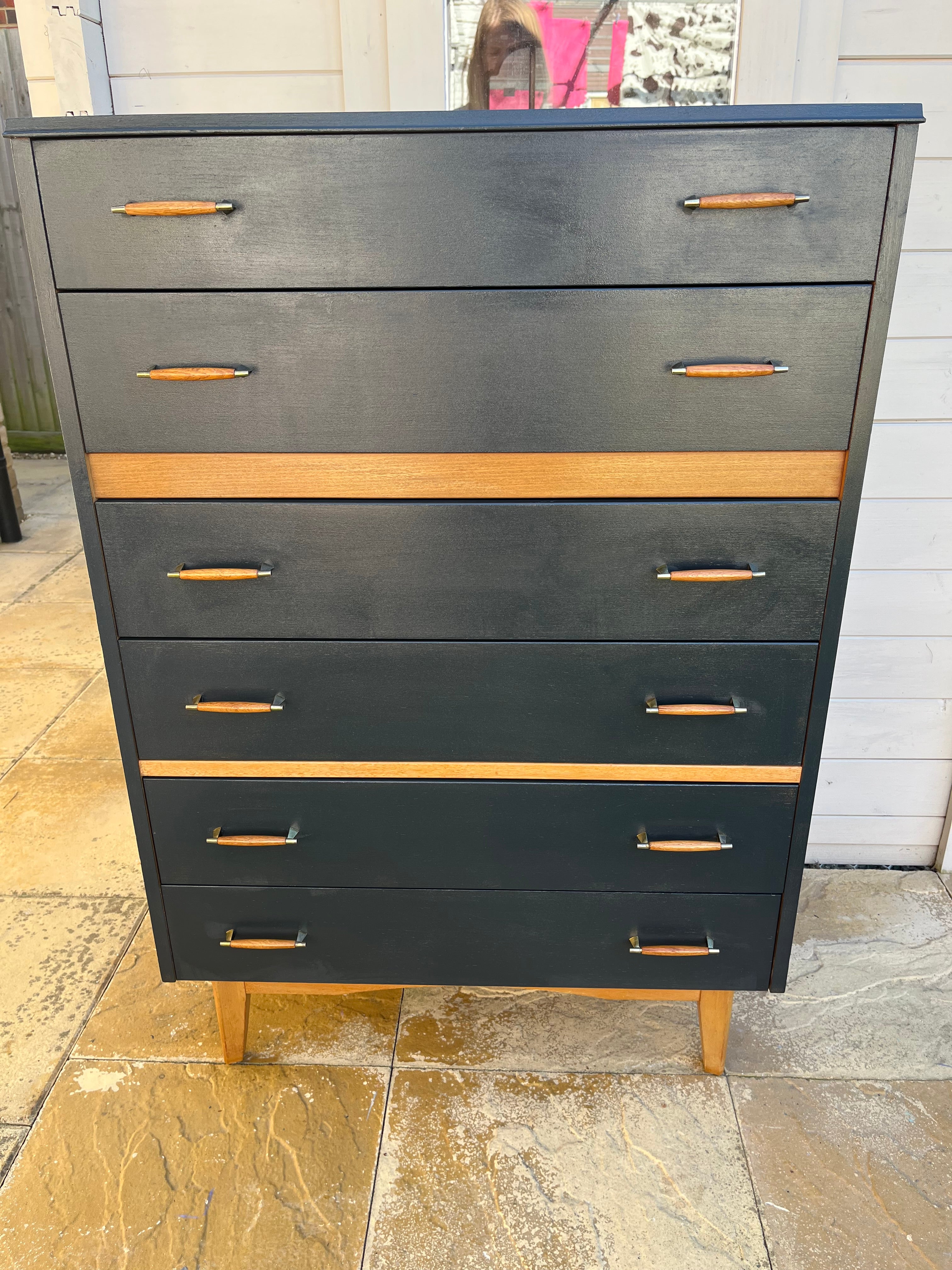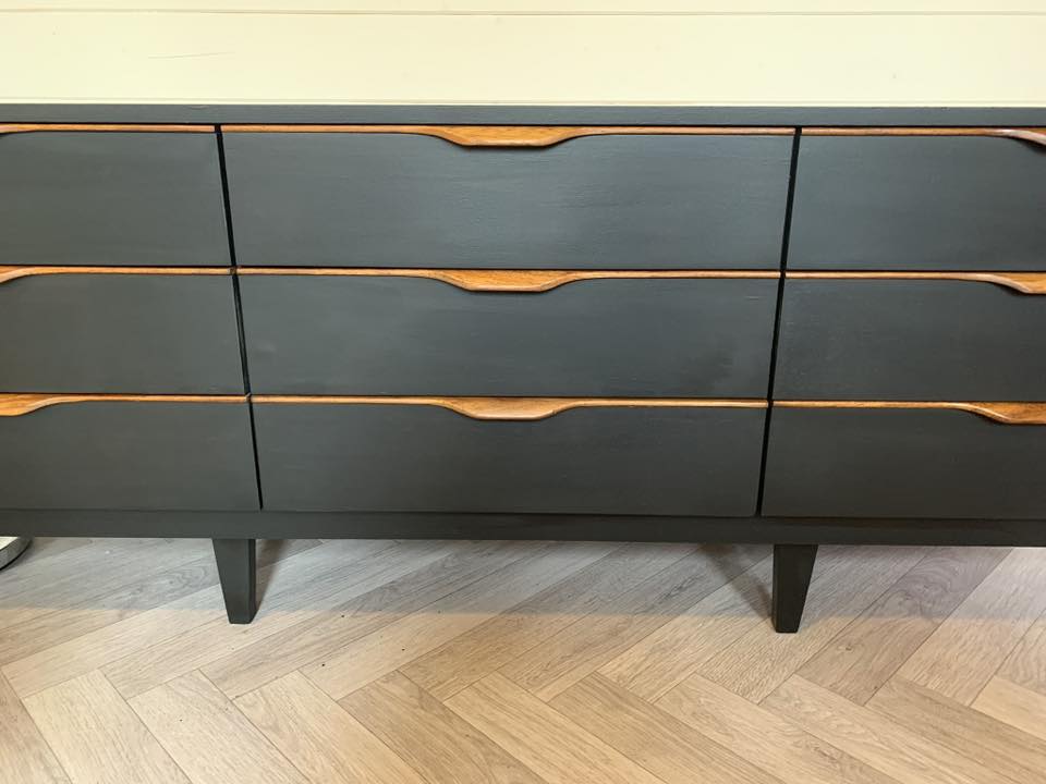 Stunning MCM chest of 9 drawers, hand painted in black with retained wood handles.