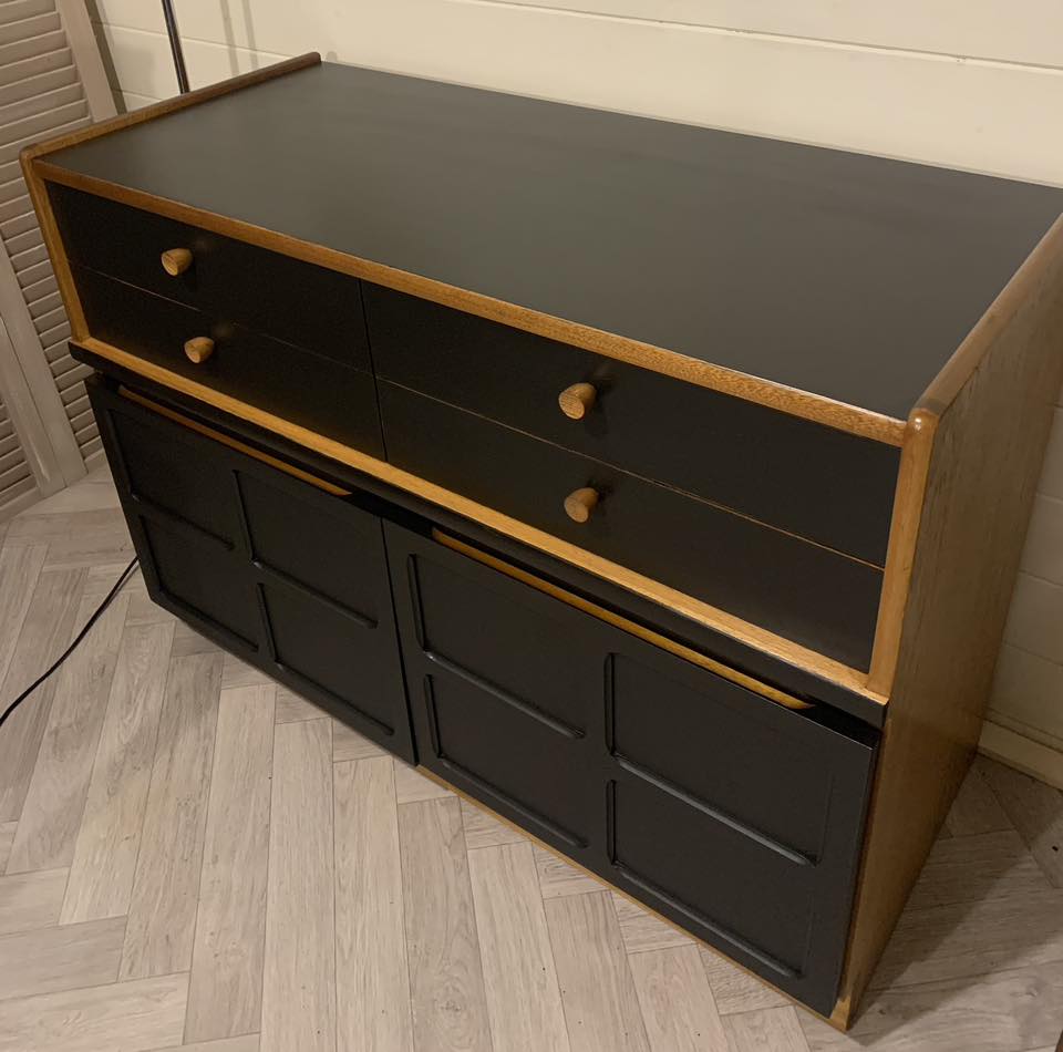 Beautiful Nathan sideboard featuring four drawers and a double cupboard. Finished in matt black with restored wooden sides and handles.