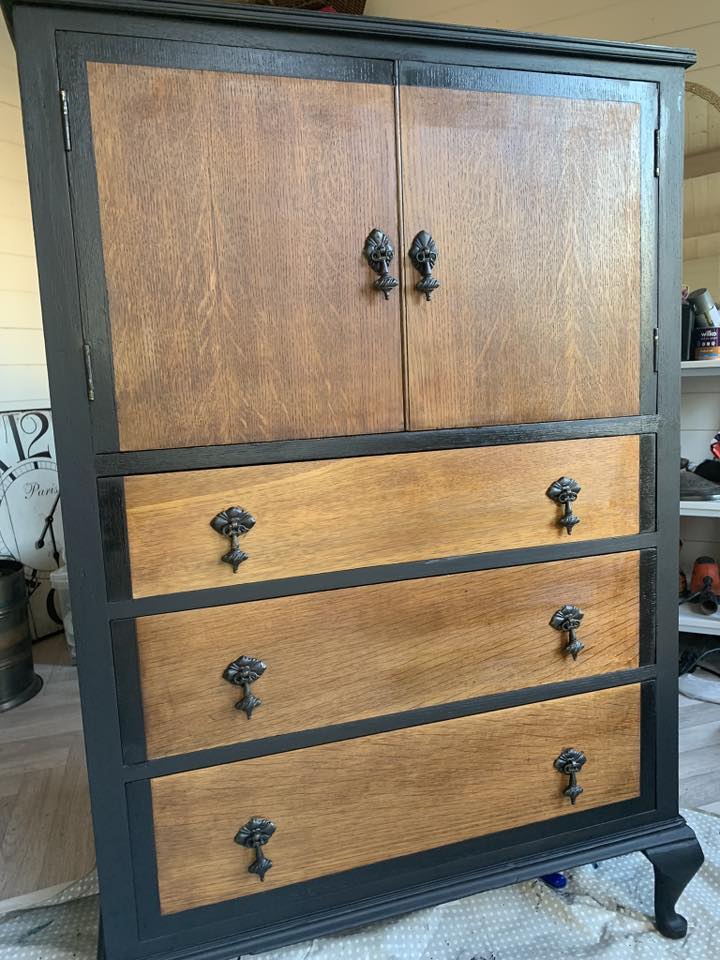 Black and wood tallboy featuring three drawers, double cupboard, Queen Anne stubby legs and original handles.