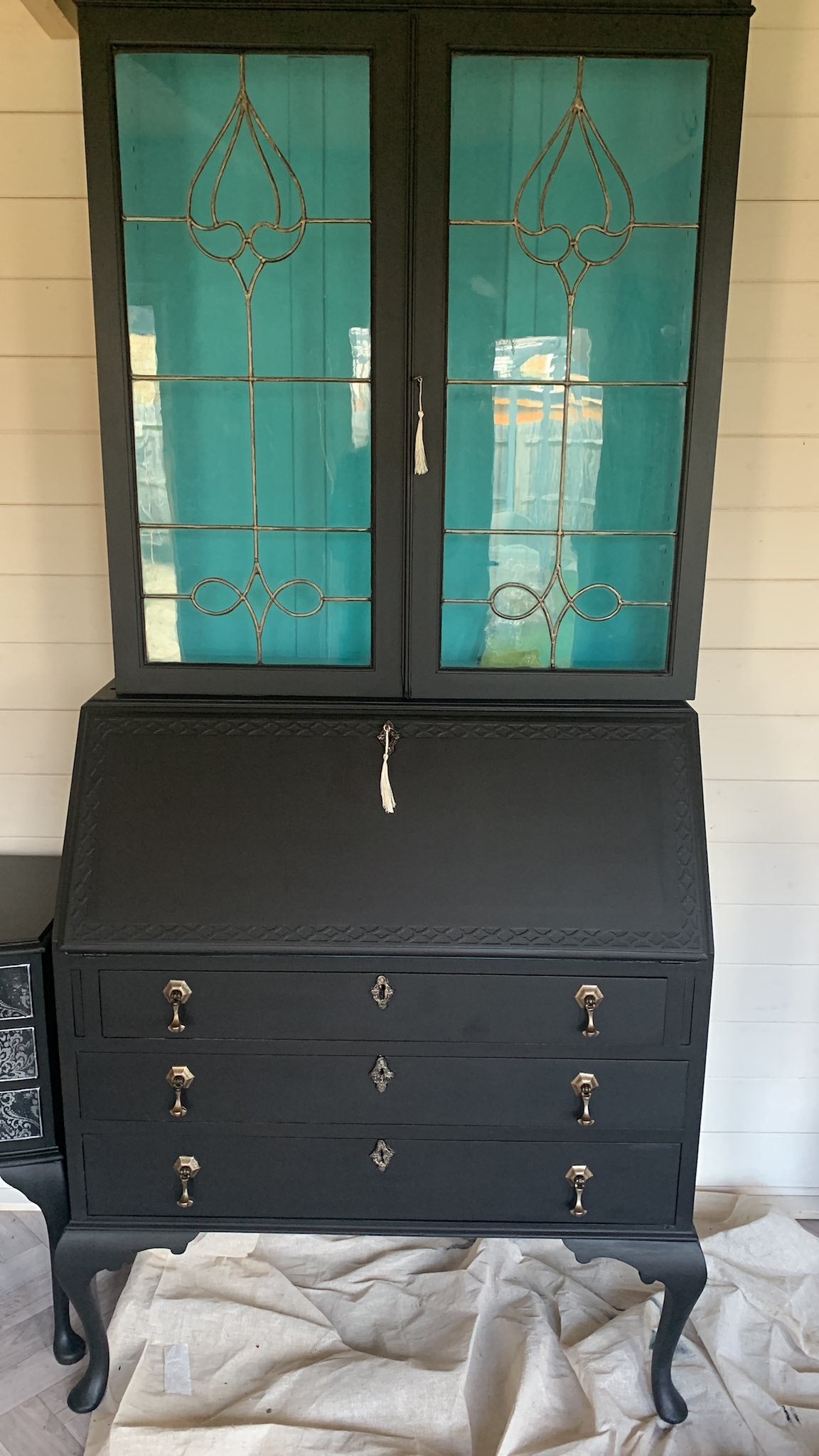 Stunning drop down bureau with glass fronted book case on top. Queen Anne style legs with original handles, hand painted in black with stunning turquoise inside.