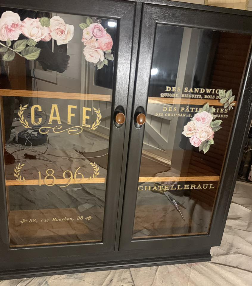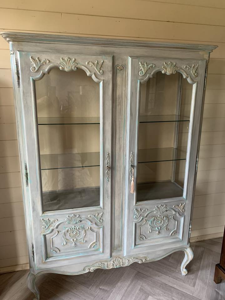 Stunning glass fronted shelving unit with gold and floral transfers to front.