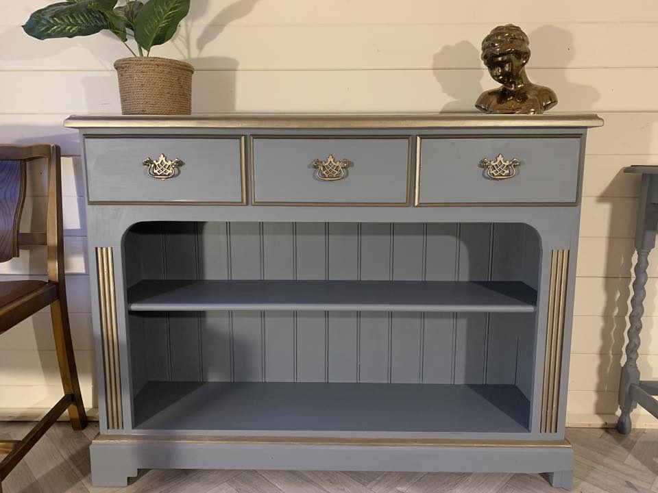 Beautiful grey and gold storage unit with shelving and drawer storage.