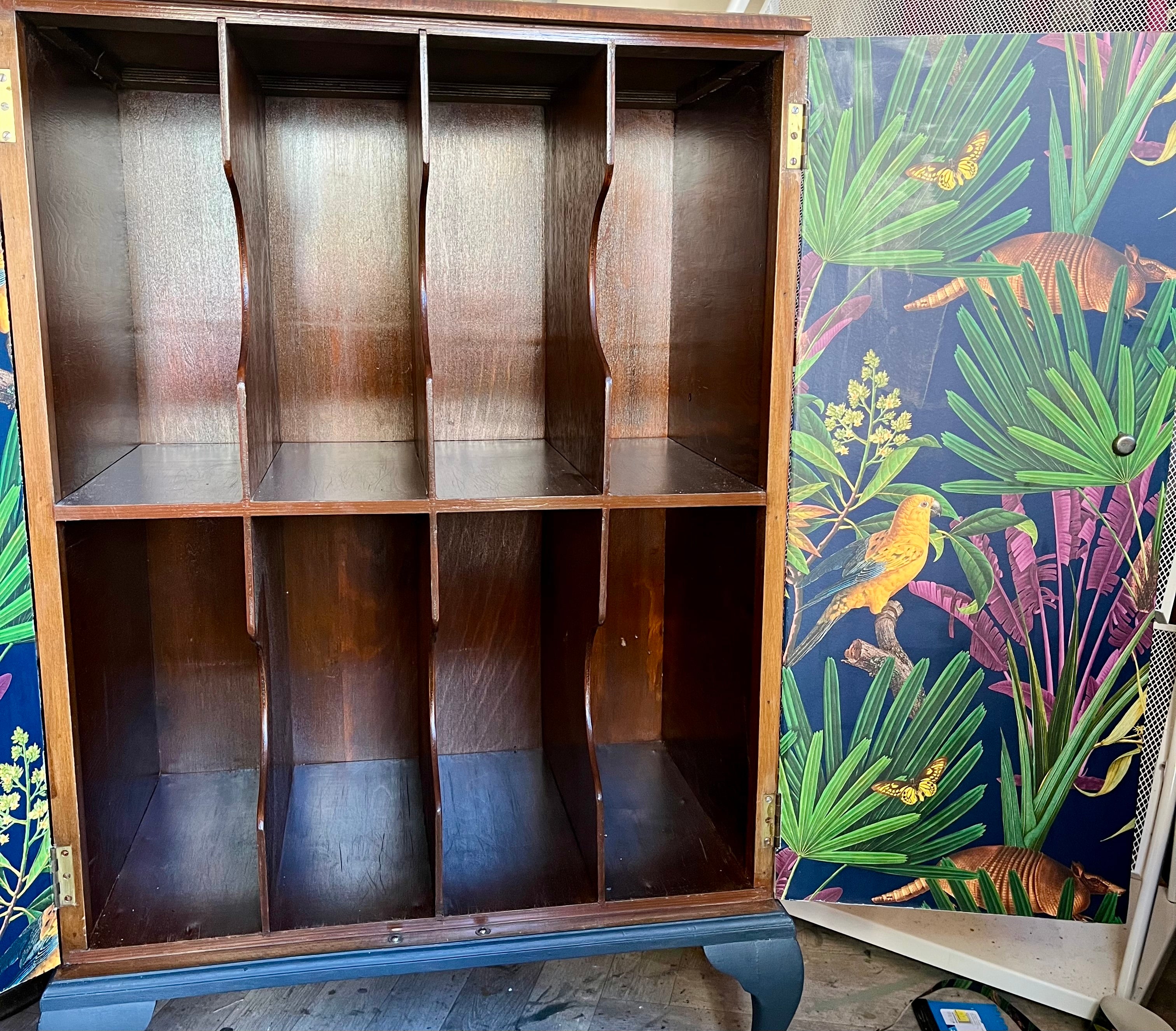 This lovely little cabinet with Queen Anne legs was sanded back and restored to its natural wood, the legs were hand painted and the inside cupboard doors were given a pop of colour using a beautiful feature paper.