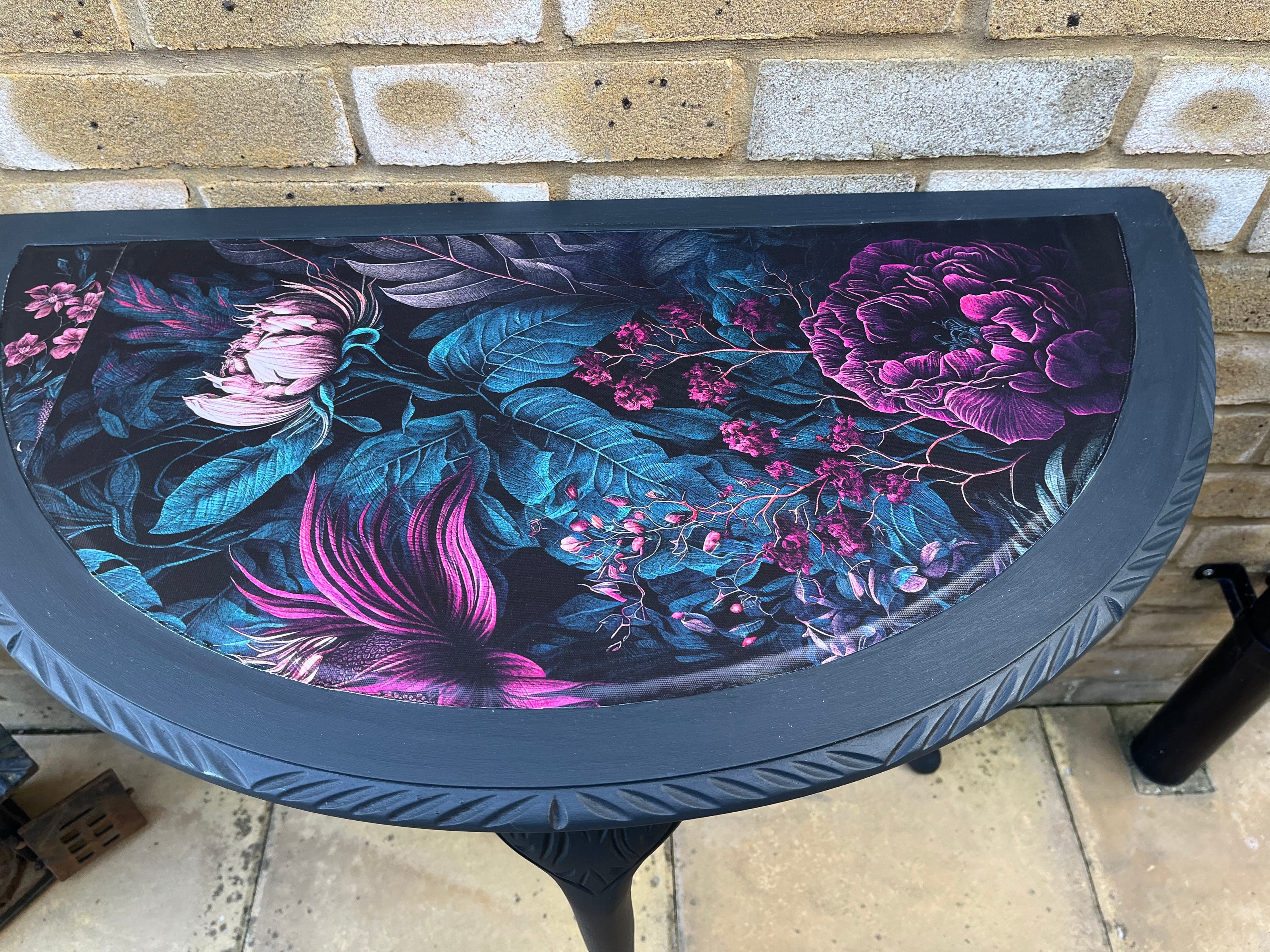This lovely little Demi Lune table was given a complete overhaul. It was painted black and the top was finished with a beautiful floral canvas.