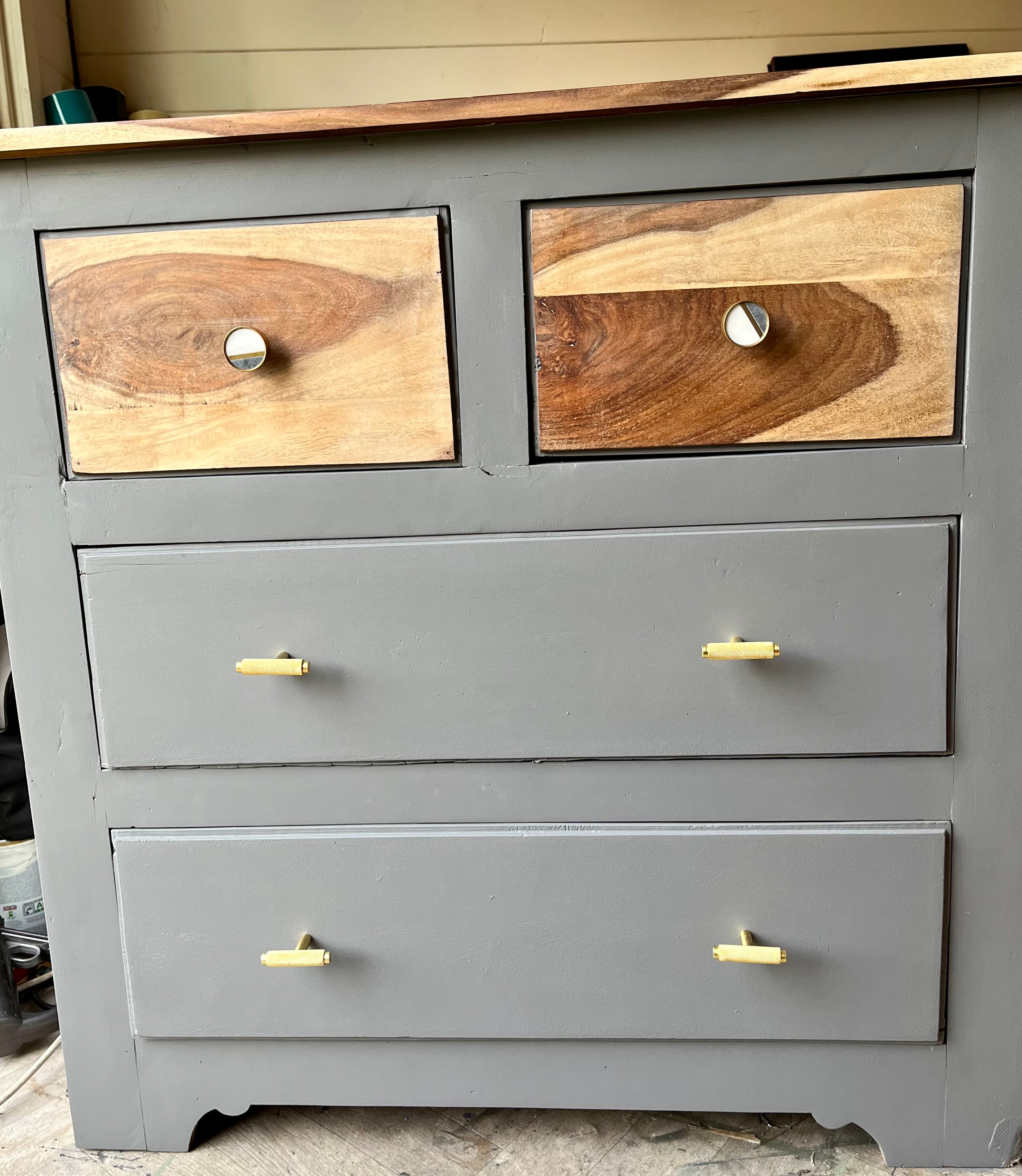 Gorgeous hand painted chest of 4 drawers. The beautiful wood has been retained on the top and two top drawers, giving it a unique finish. New handles provide the finishing touch.