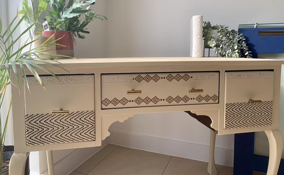 Gorgeous hand painted desk/dressing table. Finished with patterned transfers and modern handles.
