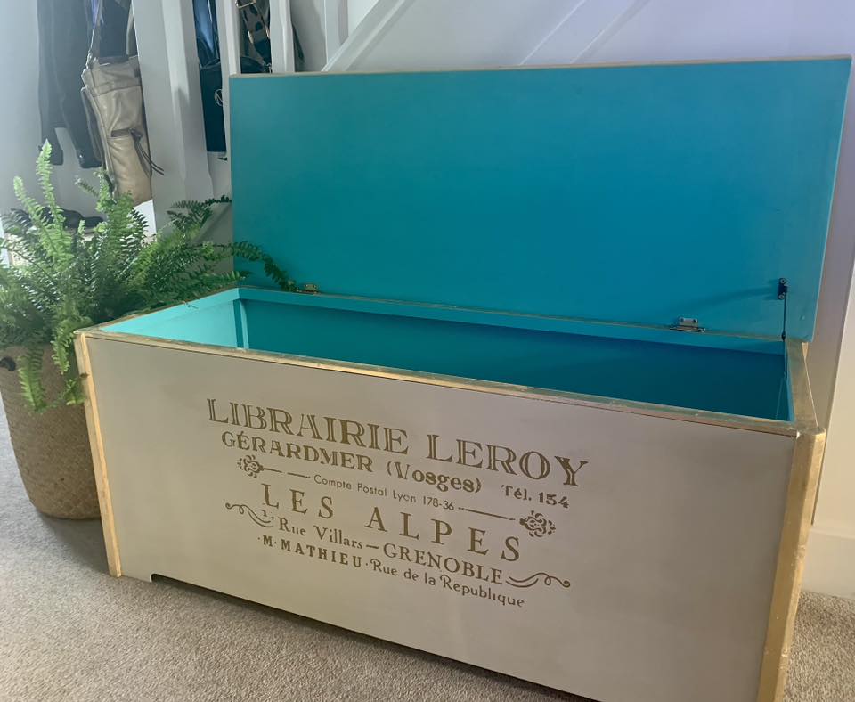 Stunning storage solution hand painted in cream with a gold script transfer to the front. Inside hand painted in bright turquoise.