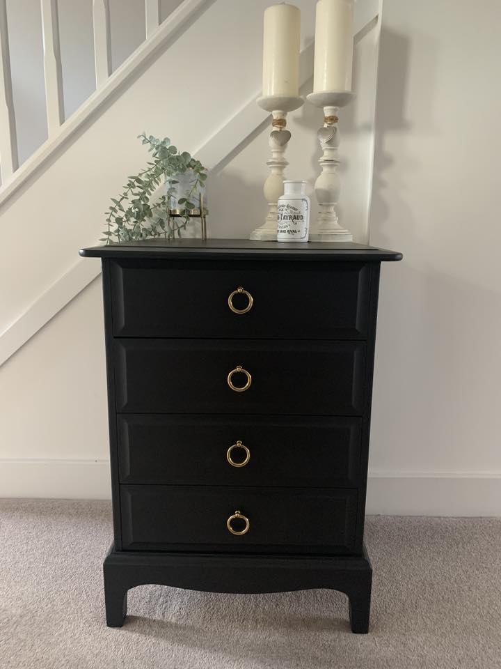 Beautiful Stag Minstrel bedside chest of drawers finished in matt black with original handles.
