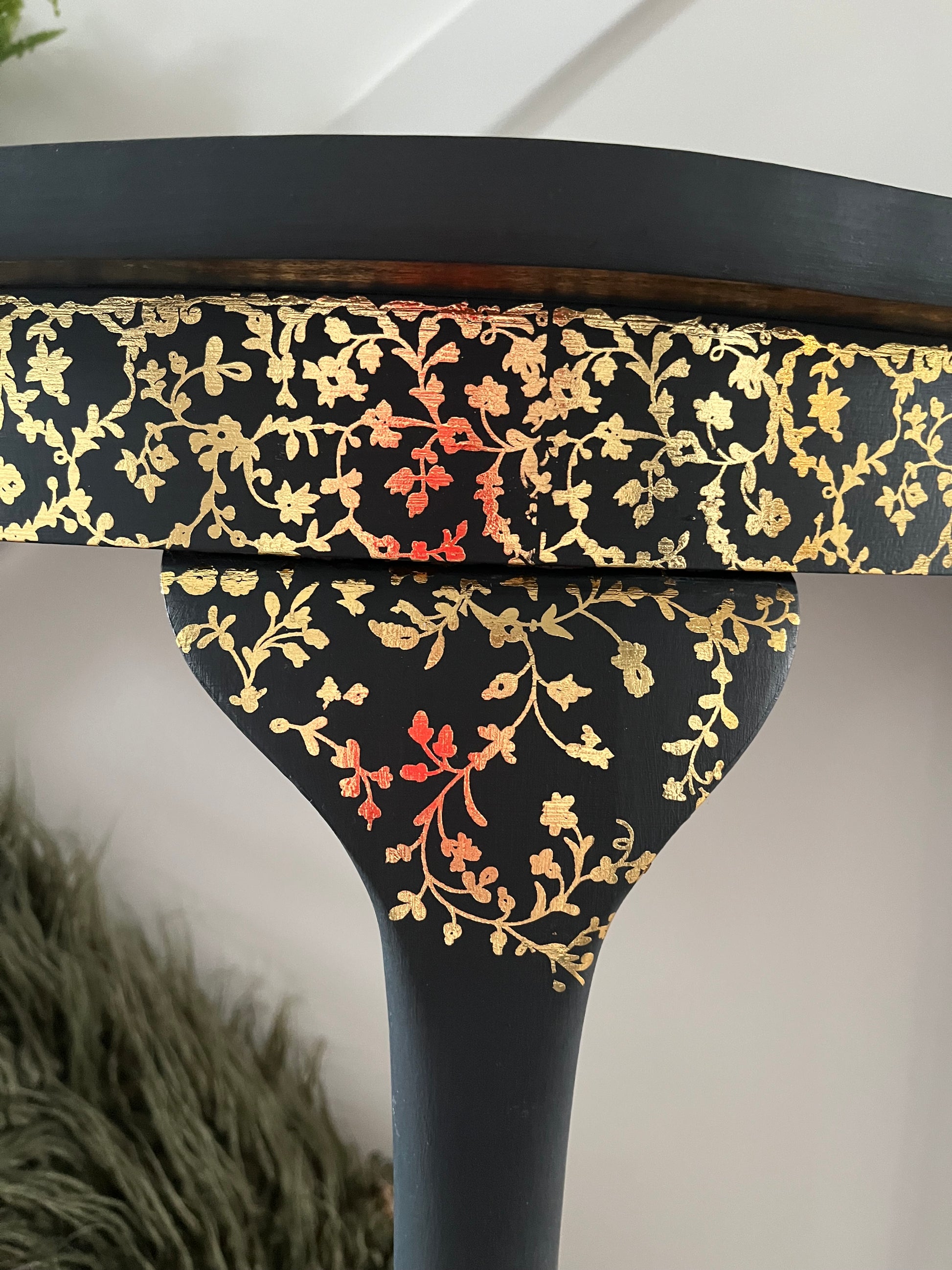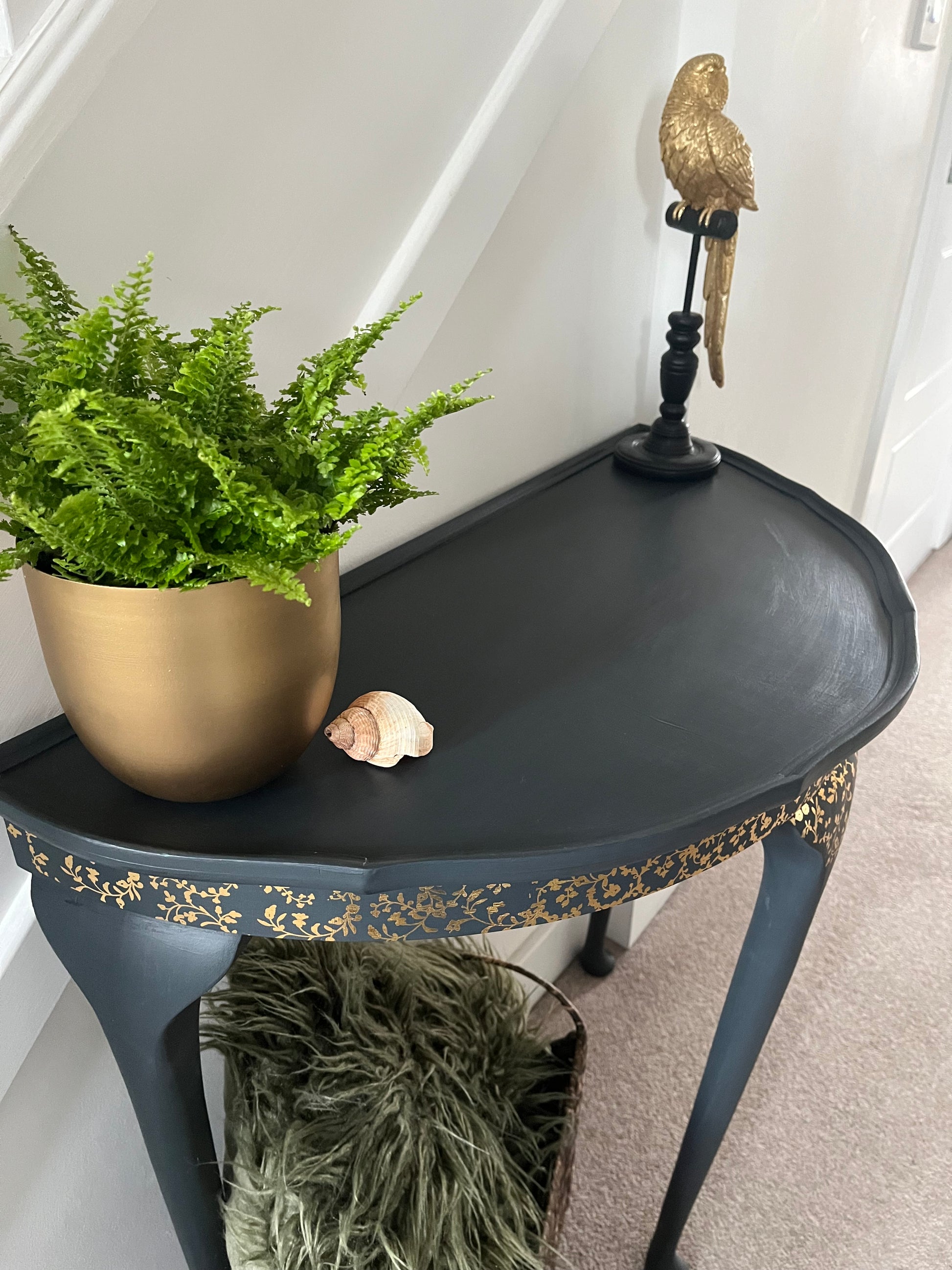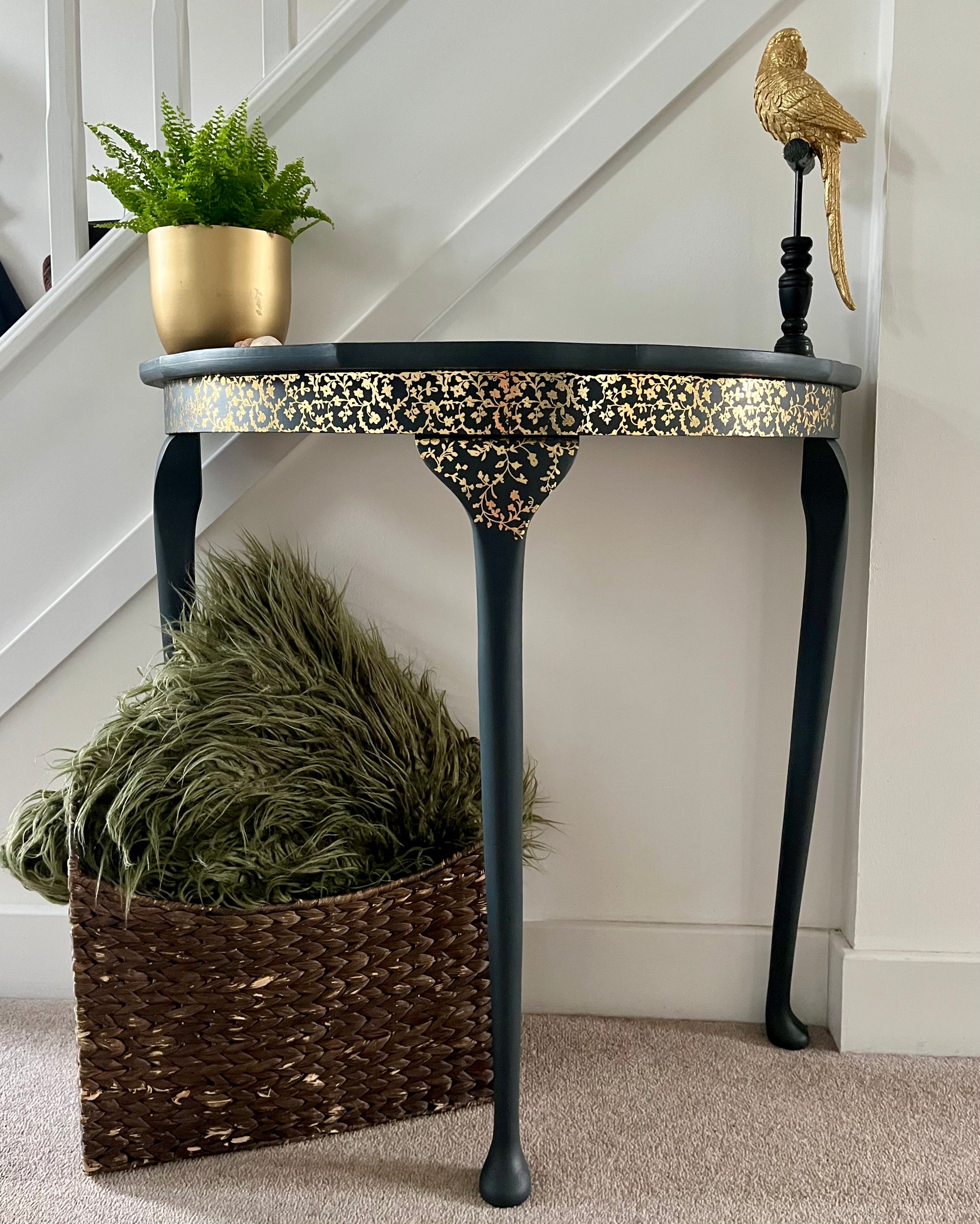This elegant demi lune table marries timeless design with contemporary artistry. Hand-painted in a bespoke finish and adorned with delicate gold foil transfer detailing to the front, it's a statement piece that elevates any interior. The graceful Queen Anne-style legs add refined proportion and period charm, making it equally at home as a hallway console, lounge side table, or bedroom accent. A versatile investment for those who appreciate handcrafted furniture with editorial appeal.