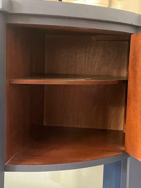 Hand-painted in soft matt navy, this serpentine sideboard combines vintage charm with practical storage. The naturally finished top showcases the wood grain beneath a protective seal, while original brass handles add authentic character. Two cupboards—one fitted with internal shelving—and two generous drawers offer flexible organisation for dining rooms, hallways or any space in your home. A statement piece that works equally well in contemporary or traditional interiors. H93 × L137 × D52cm.
