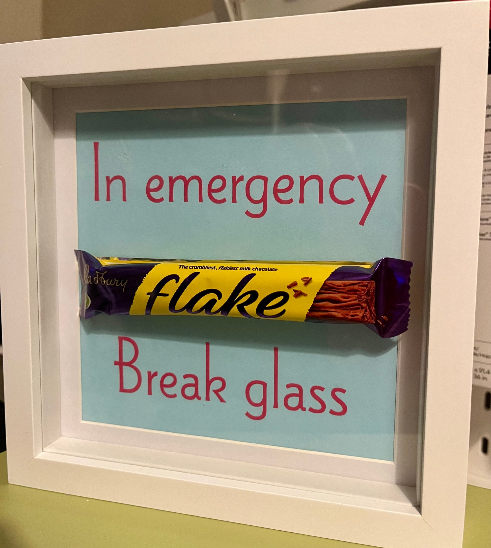 A charming gift that combines humour with practicality. This white shadowbox frame features a witty "break glass in case of emergency" message paired with a chocolate bar—ideal for adding a smile to any room.